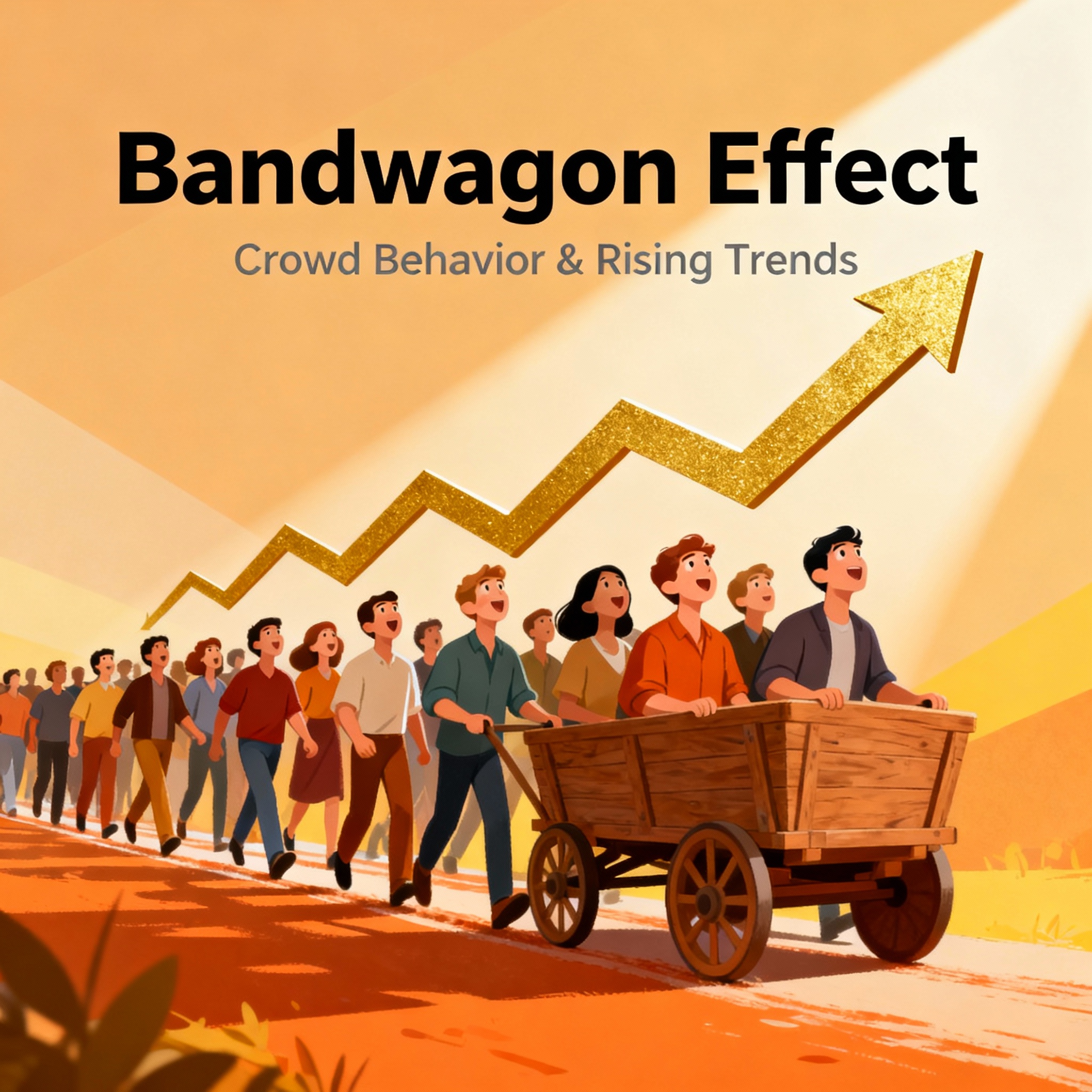 밴드왜건 효과는 다수가 선택하는 대상을 더 선호하거나 따라가는 경향을 뜻한다. 군중이 움직일수록 가치가 더 커 보이고, 선택의 기준이 집단의 움직임에 맞춰지는 흐름이 만들어진다. 콘서트 퍼레이드에서 악대 뒤를 따르는 장면에 비유해 붙은 이름으로, 한 번 흐름이 생기면 더 많은 선택이 몰려 파급력이 커진다. 온라인 리뷰 수, 판매량 배지, 실시간 급상승 표기, 여러 플랫폼에서 반복 노출되는 트렌드 등이 이 흐름을 강화한다.